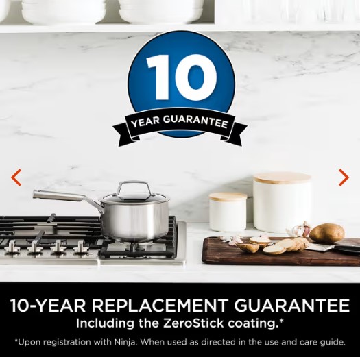 10-Year Guarantee: Covered by Ninja's 10 Year Replacement Guarantee, including the ZEROSTICK coating*.