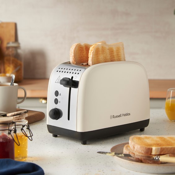With a natural colour scheme and polished stainless-steel accents, the Russell Hobbs® Classics Jasmine 2 Slice Toaster goes well with both a traditional and contemporary kitchen aesthetic. You can be sure every mouthful is toasted to a crunch with the longer slots, and Fast Toasting technology means you’ll barely have time to grab your butter knife before the pop. Check on your bagel without interrupting the heating cycle with the Lift and Look lever, and make every slice just how you like it, even if it’s straight out of the freezer, with the frozen / reheat / cancel functions. The crumb tray catches all the bits, and the cord storage keeps your worktop clutter-free. When you need to retrieve small snacks, the high lift lever is there to help.